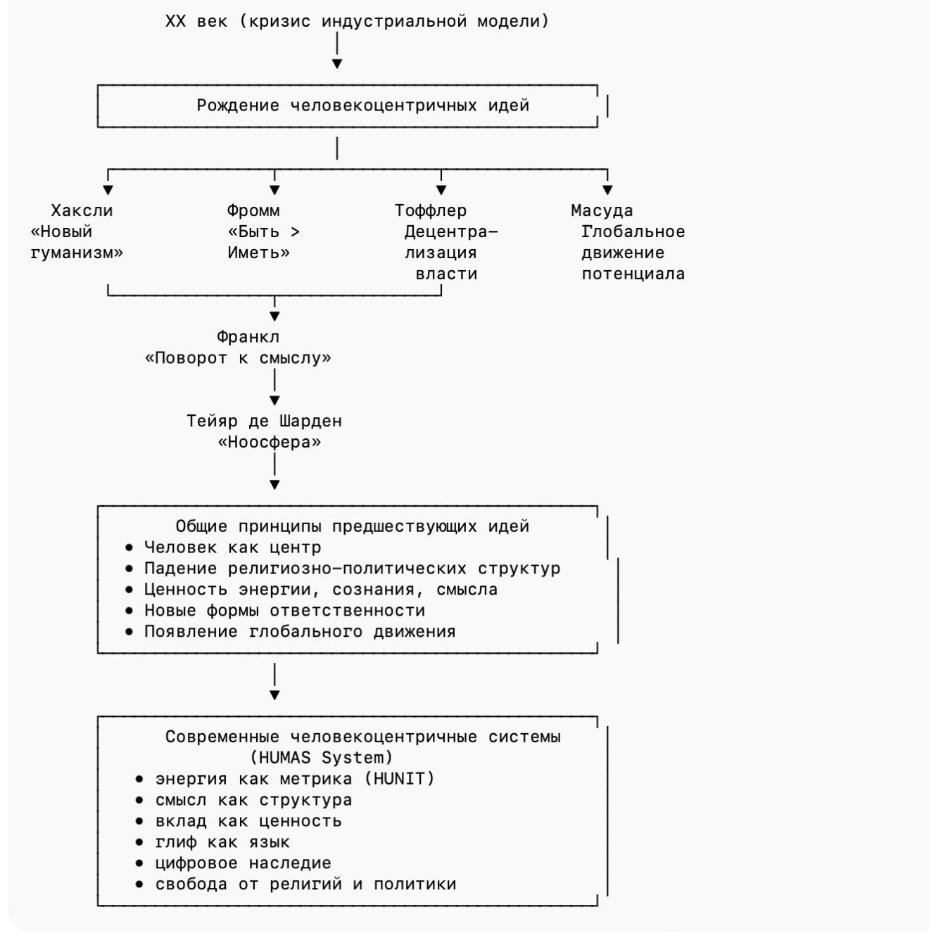 Философские и футурологические концепции XX века демонстрируют устойчивую тенденцию к поиску новой человекоцентричной структуры общества. Они задают направление, но не создают реализацию. HUMAS System можно рассматривать как современный пример практической попытки воплощения этих идей в цельную архитектуру, объединяющую философию, технологию и социальную динамику.